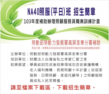 辦理「103年度補助辦理照顧服務員職業訓練計畫」「NA40照服(平日)班」 招生簡章